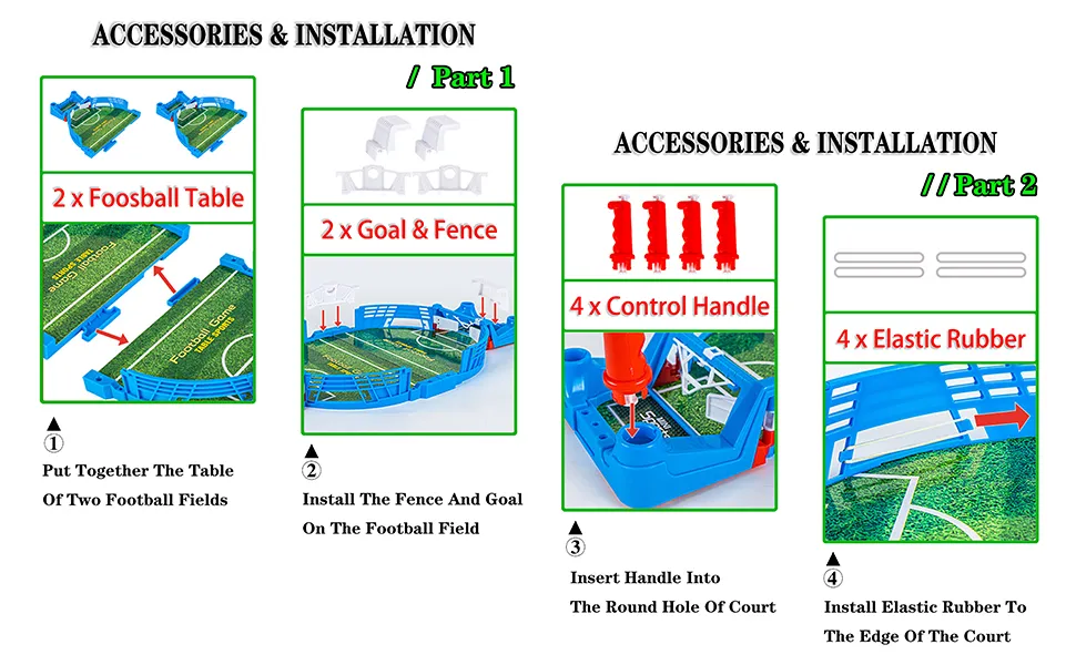 • ? Tabletop Game Set: Including football tables, 4 control handles, 2 shooting goals, 2 footballs, 2 fences and rubber bands. A perfect miniature version of a real football field. Everything you need is there for you to enjoy board football games. This game can train hands-on ability and improve hand-eye coordination.